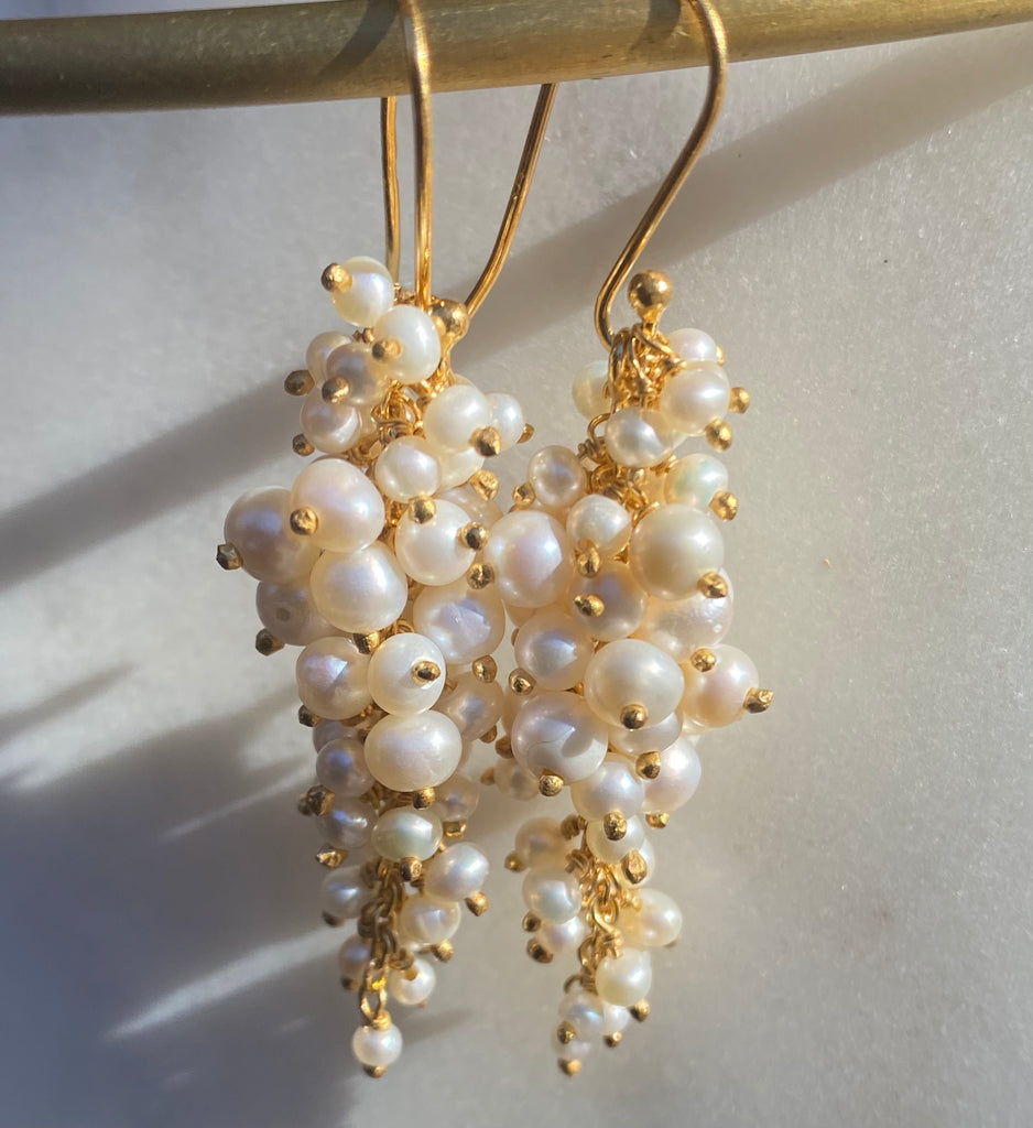 Treasures by Mayas Creative designer, Maya, likes when jewelry is so unique that it becomes a topic of conversation and that'll certainly be the case when you're wearing these clustered Love bunch earrings. They're handmade from 18K goldplated silver and decorated with an array of luminous pearls In different sizes to make the iconic look🤍