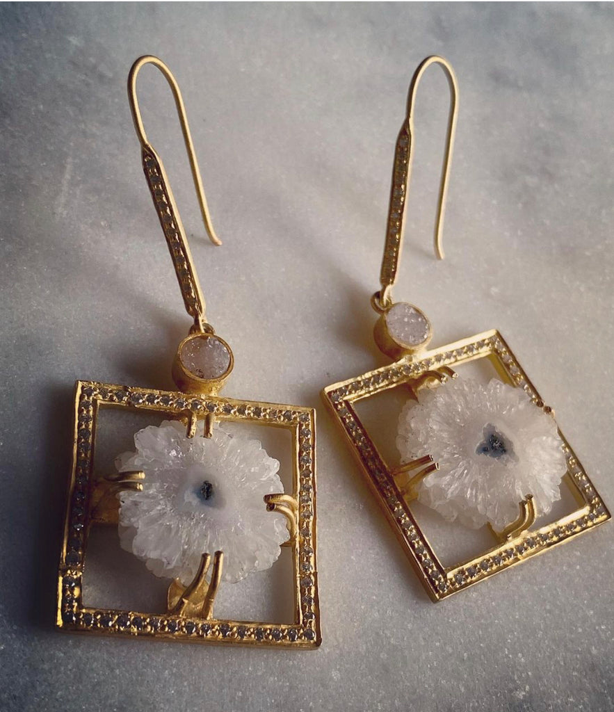 «My Precious» Feel strong and protected with the pure natural druzy agate, which is a protective mineral with ancient stories to tell. The agates has Been carved into holy objects and magic amulets since first discovered thousands of years ago. It is believed to grant powers of invisibility and courage! A magic touch to your wedding dress or just an evening out.